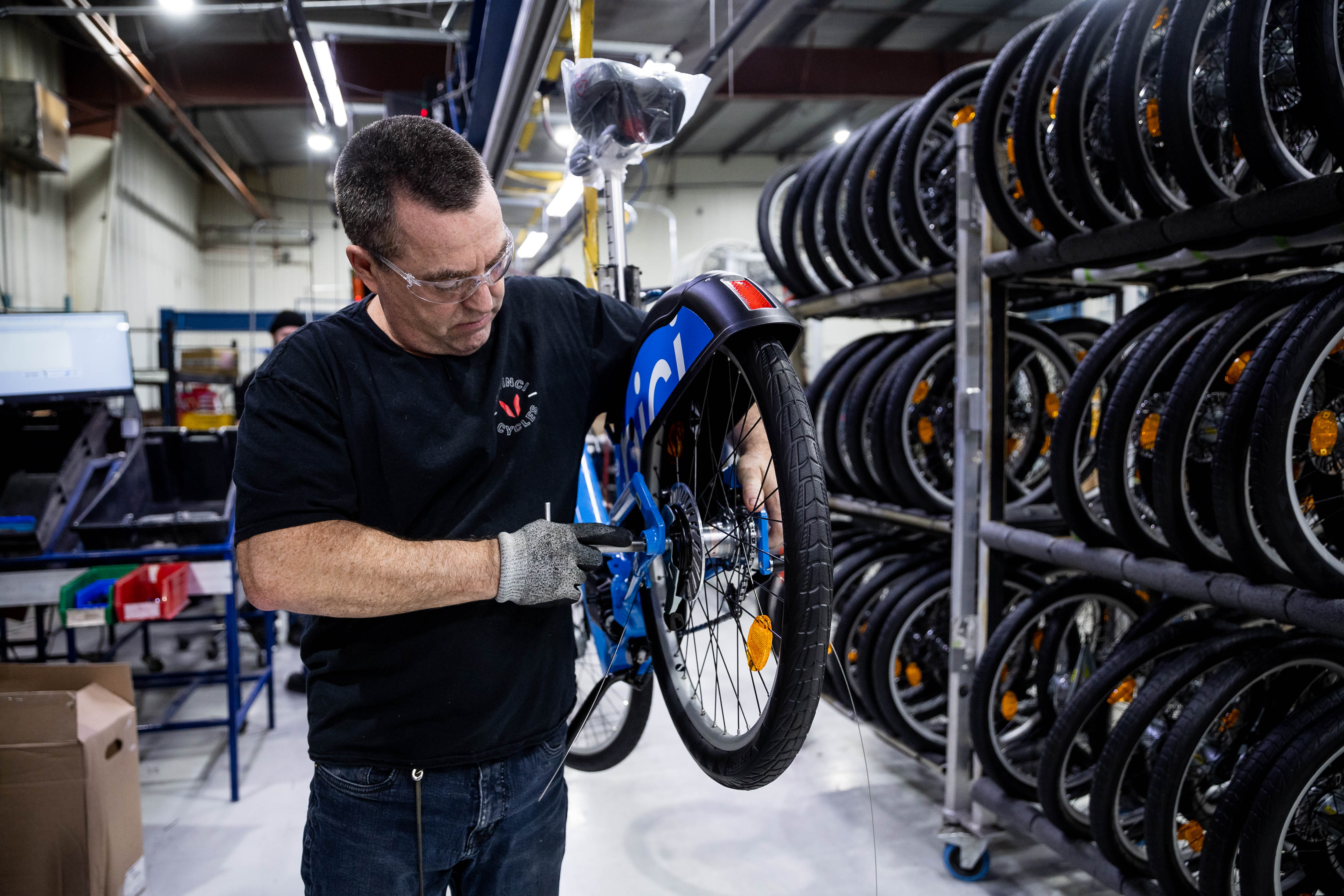 Aligned frames are powder-coated, then placed in an oven to cure both the paint and clear coat, before receiving their final decals and graphics ahead of full assembly.