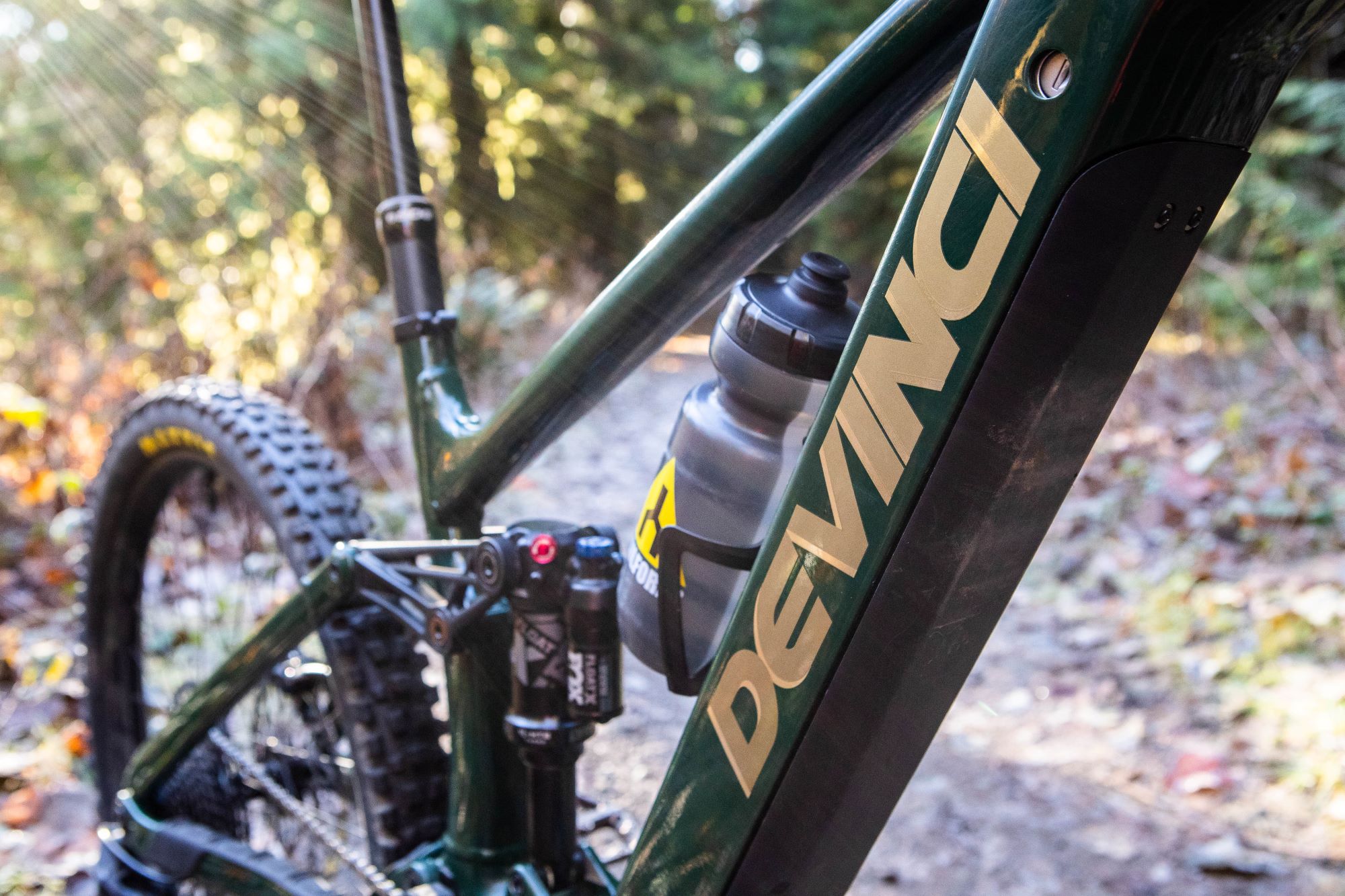 A 185x55mm shock provides 150mm of rear wheel travel, utilizing a trunnion mount. Devinci says that their dual-row bearings and seatstay bridge leads to a stiffer design than the than previous E-Troy.