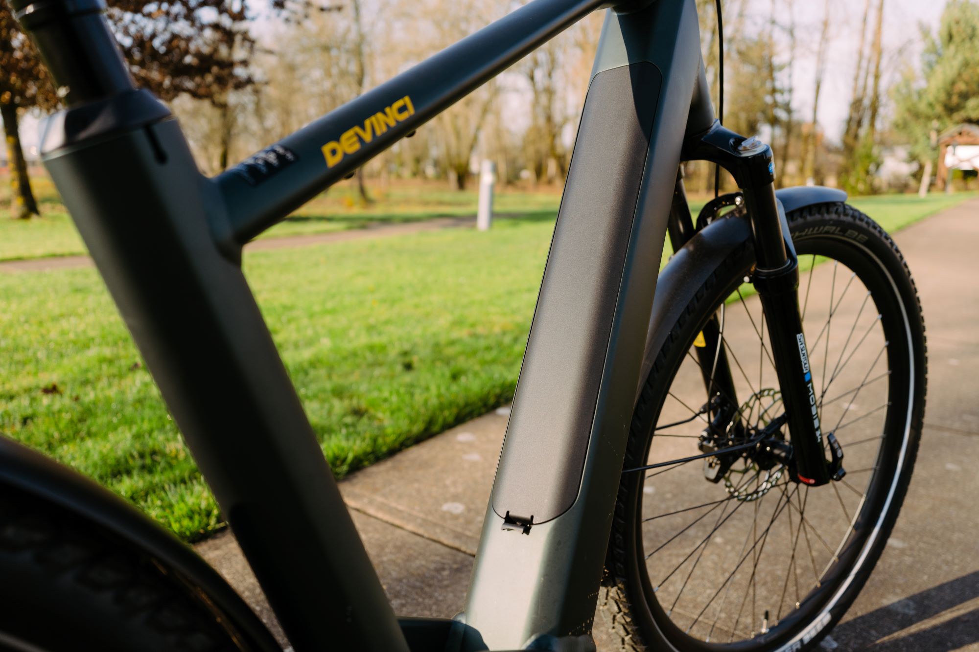 The battery is removable from the frame with a key and has a very low profile cover that disappears into the downtube of the frame.
