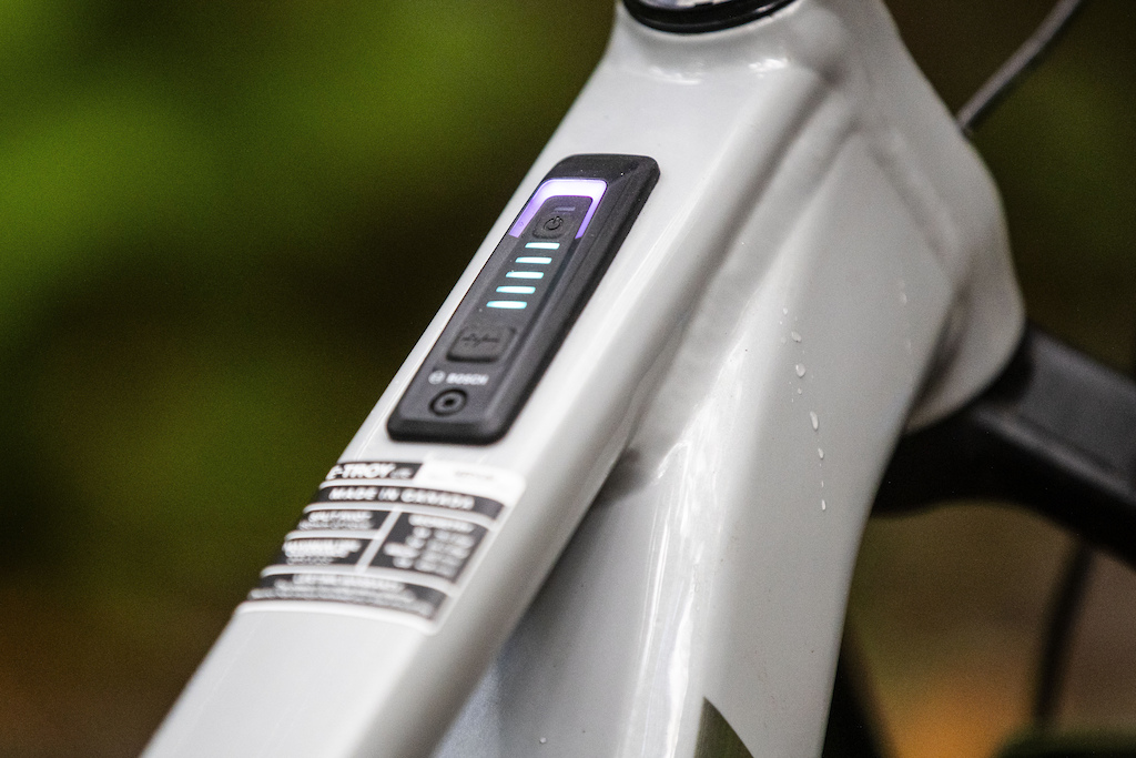 La batterie cachée dans le tube diagonal de l'E-Troy Lite est la batterie CompactTube 400 de Bosch. Elle pèse environ 1995 grammes et offre 400 Wh. C'est actuellement la batterie eBike Bosch avec la plus haute densité énergétique. Le vélo est également compatible avec le PowerMore 250, qui ajoute 250 Wh supplémentaires. Ce prolongateur d'autonomie est à peu près de la taille d'une bouteille d'eau et pèse 1,6 kg (3,5 lb).