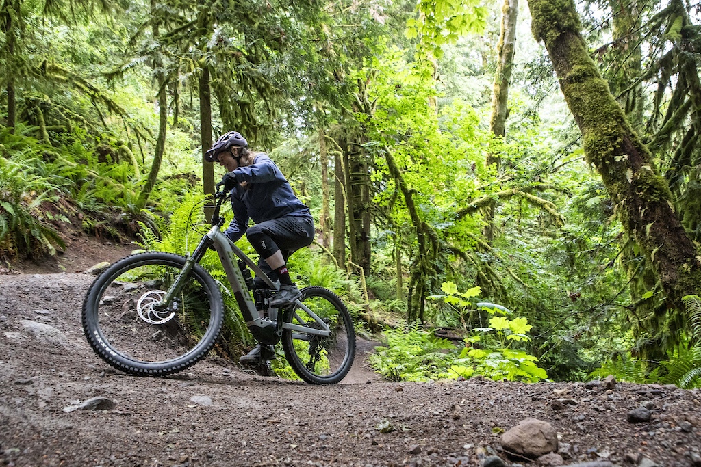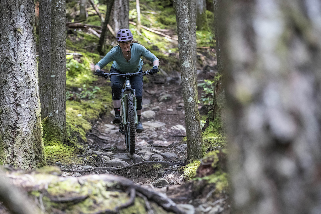 J'ai passé la majeure partie de mon temps dans les modes Tour+ (deuxième) et eMTB (troisième) sur les montées en singletrack, car ils offraient la quantité d'assistance parfaite sans épuiser la batterie ni me donner l'impression d'être submergé par la puissance. Je n'ai jamais ressenti le besoin de freiner violemment en montée, ce qui est une sensation que j'ai déjà eue avec certains vélos électriques à pleine puissance. Dans l'ensemble, dans les modes intermédiaires, la puissance est délivrée de manière si fluide et naturelle qu'on a vraiment l'impression d'être une version plus en forme de soi-même lors des montées. Il est important de mentionner que j'ai une cadence de pédalage naturellement élevée, ce qui est certainement un facteur dans ma bonne entente avec le moteur Bosch Performance SX. Si l'on devient paresseux avec les changements de vitesse et que l'on se retrouve avec une cadence plus basse, on peut avoir l'impression que le moteur ne fournit pas autant de puissance.