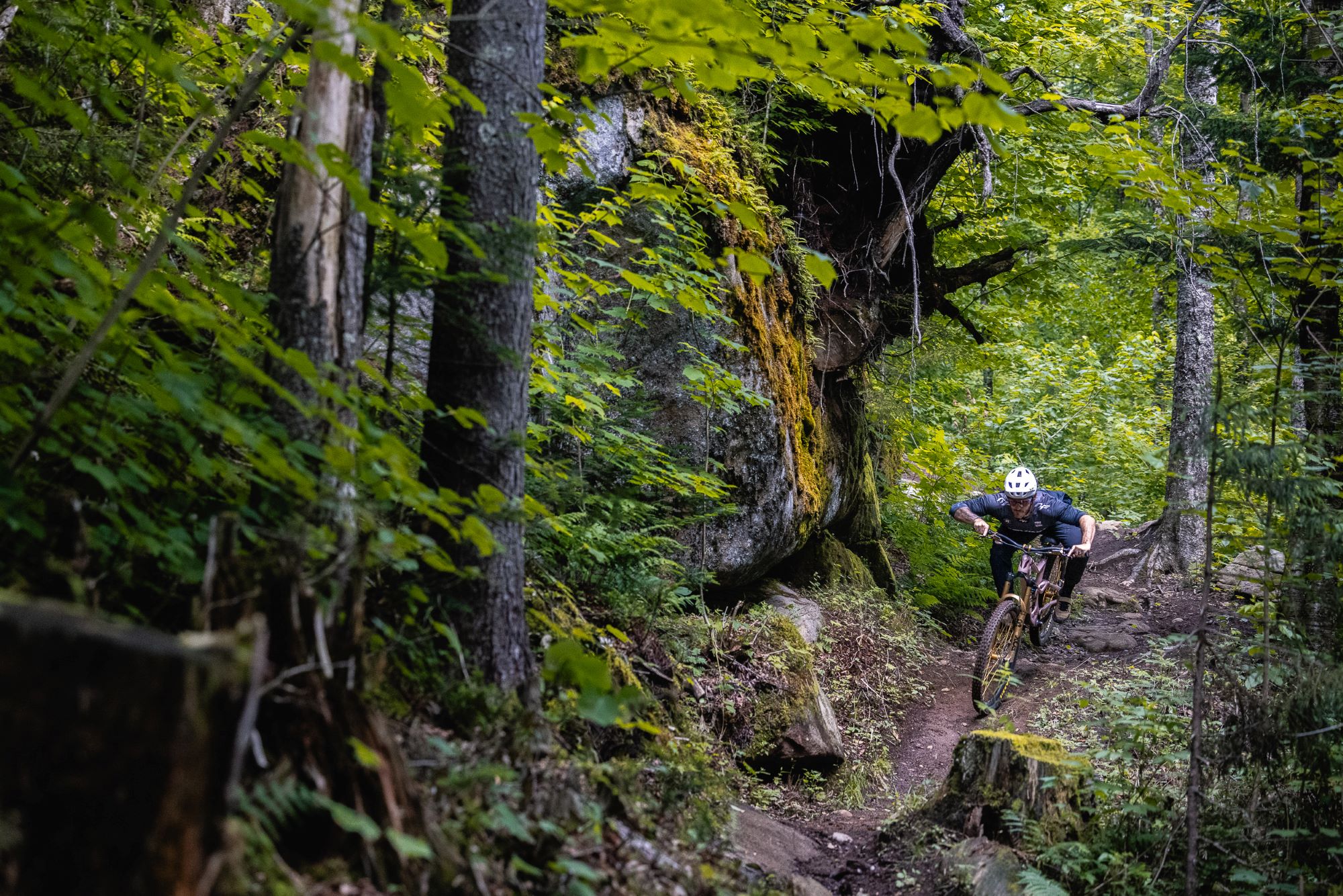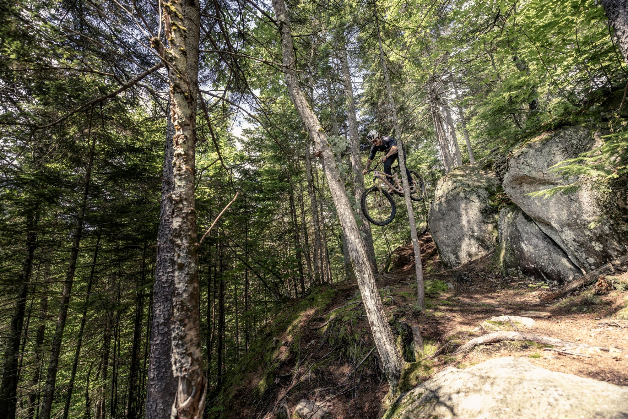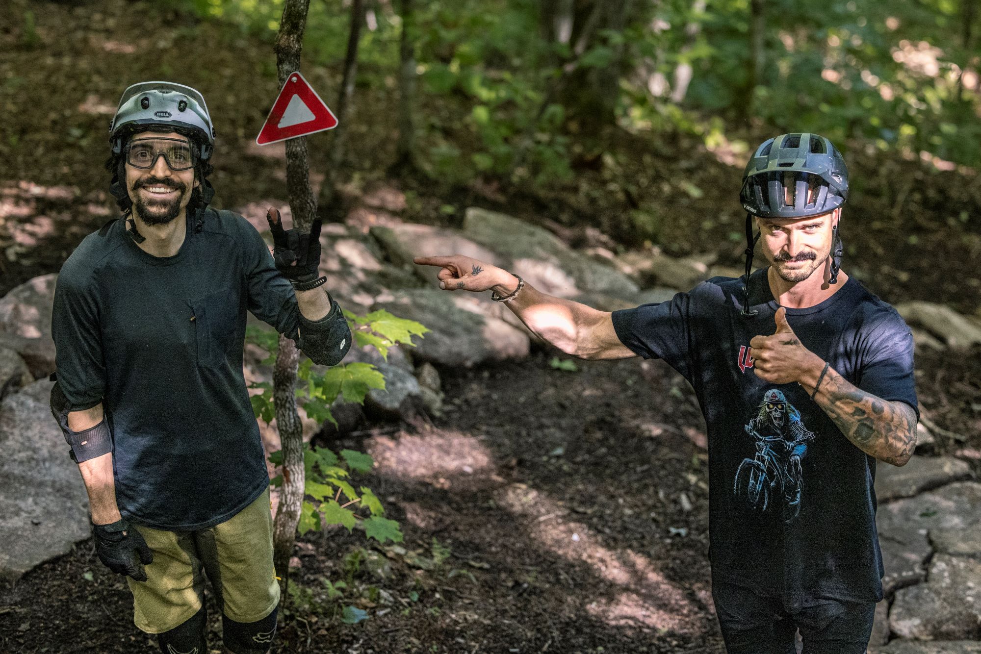Un peu de pluie n’allait pas empêcher les gars de partir sur les sentiers. Yoann et Steve ont dévalé les classiques comme Haute Valkyrie et Nosferatu, et ont même eu la chance d’être parmi les premiers à essayer un nouveau sentier de sauts. Les gars ont rencontré l’équipe de sentiers d’Empire 47 et ont pu échanger et en apprendre davantage sur le nouveau sentier qu’ils ont testé.