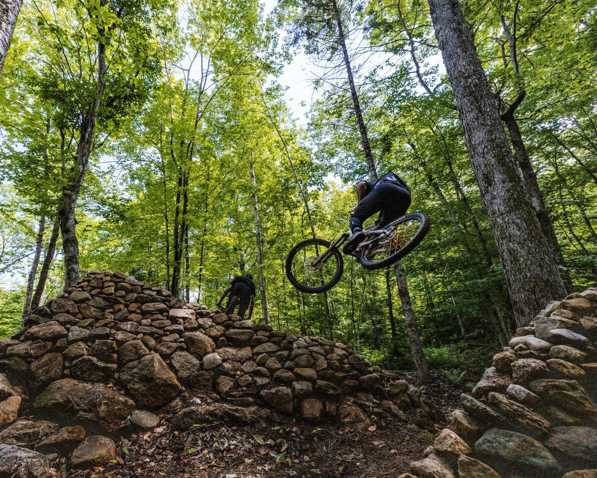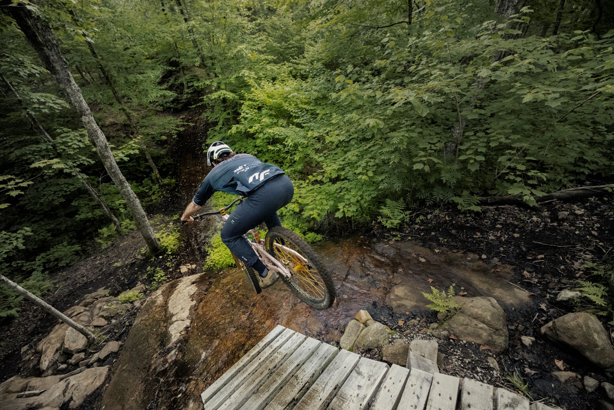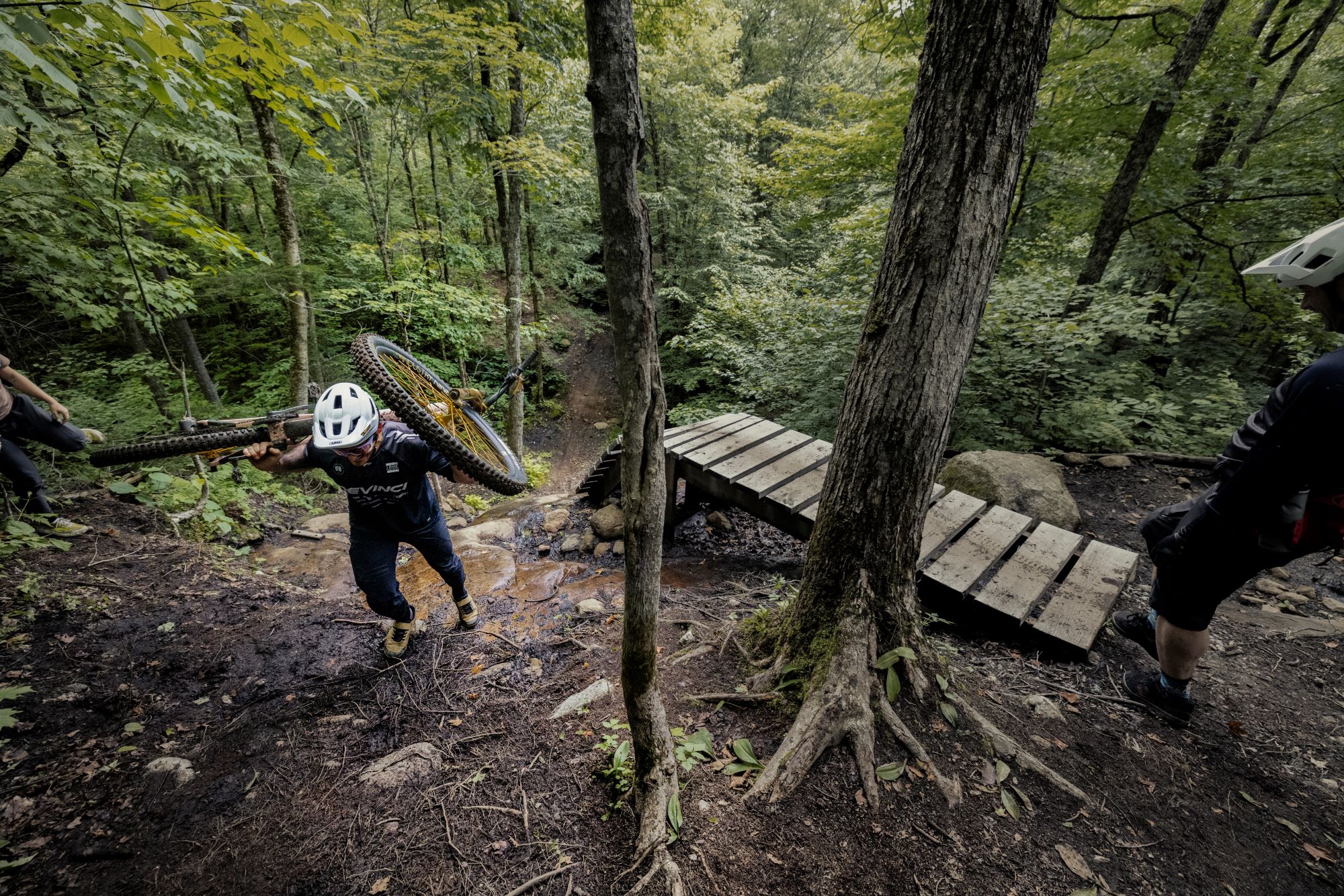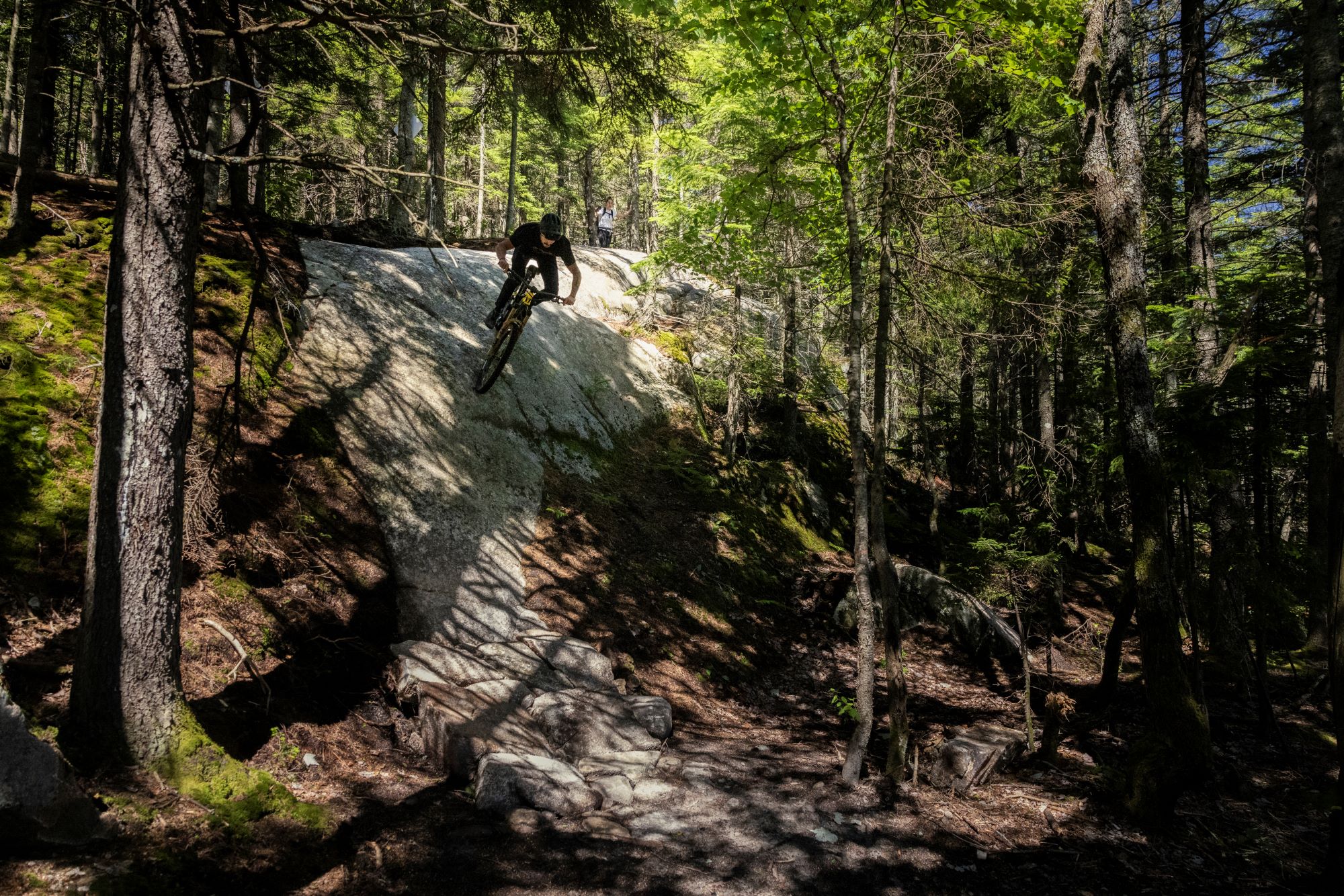 Un peu de pluie n’allait pas empêcher les gars de partir sur les sentiers. Yoann et Steve ont dévalé les classiques comme Haute Valkyrie et Nosferatu, et ont même eu la chance d’être parmi les premiers à essayer un nouveau sentier de sauts. Les gars ont rencontré l’équipe de sentiers d’Empire 47 et ont pu échanger et en apprendre davantage sur le nouveau sentier qu’ils ont testé.
