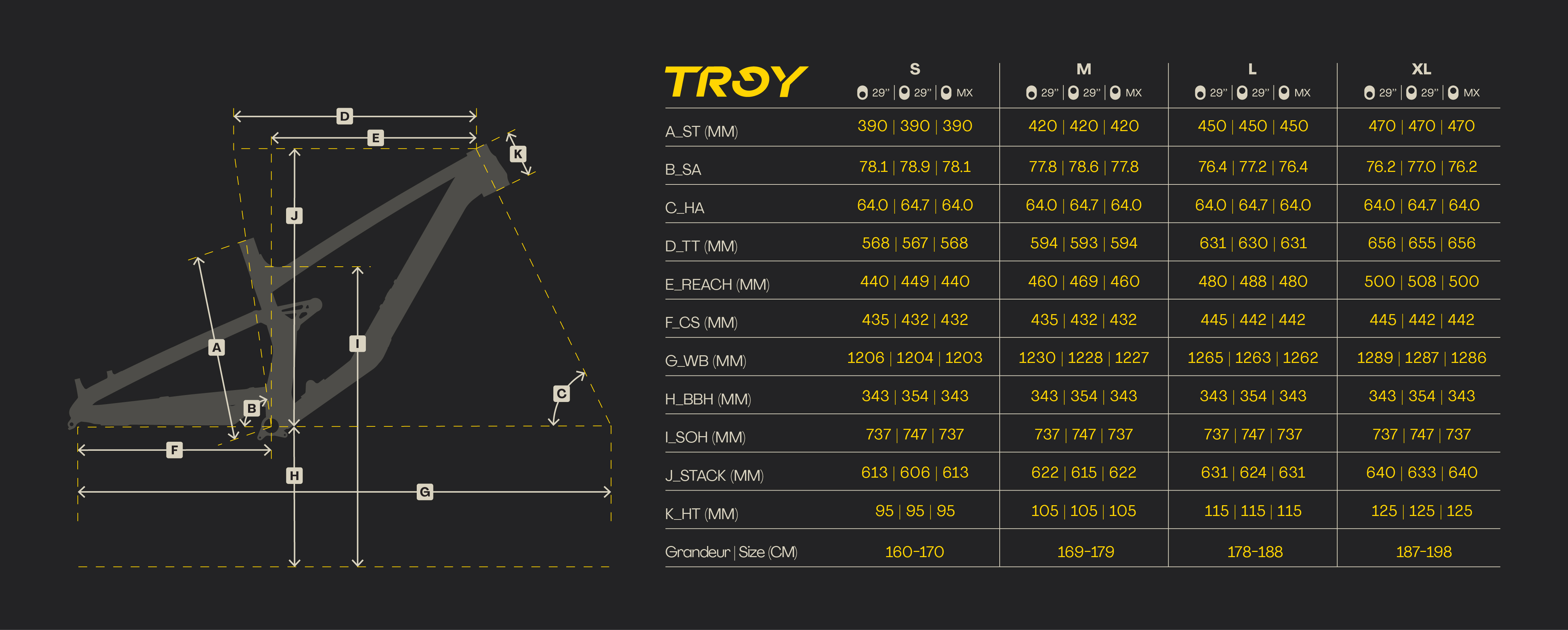 La géométrie améliorée rend le Troy encore plus performant que jamais. Un angle de direction plus ouvert permet d'attaquer en toute confiance les sections techniques, tandis qu'un angle de selle plus fermé vous facilite le travail en montée.